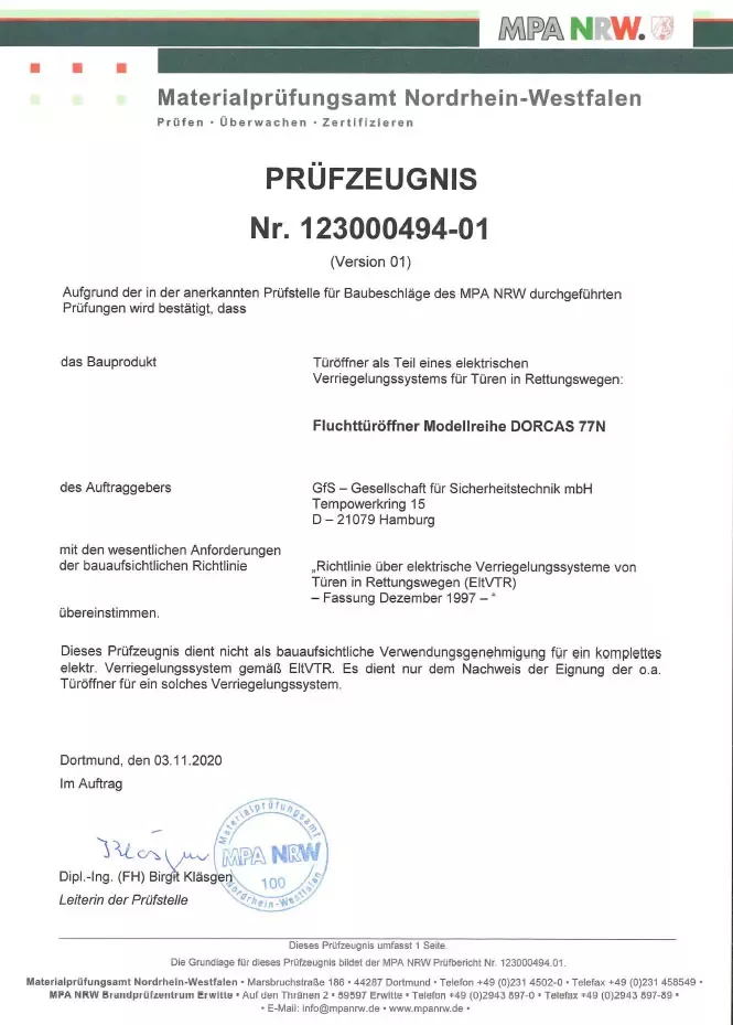 Testy elektrozaczepu Dorcas 77N zostały przeprowadzone na wniosek Gesellschaft für Sicherheitstechnik mbH. Po ich zakończeniu instytut MPA NRW opublikował raport z badań Nr. 123000494-01 (Version 01). Niniejszy dokument potwierdza, że urządzenie jest zgodne z wytycznymi dla elektrycznych systemów ryglowania drzwi w ciągach ewakuacyjnych (EltVTR) i może być stosowane na drzwiach znajdujących się na drogach ewakuacyjnych.