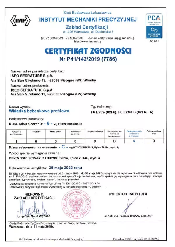 Wkładki bębenkowe R7 Extra, R6 Extra, F6 Extra oraz F6 Extra S marki ISEO zostały przebadane przez Instytut Mechaniki Precyzyjnej i otrzymały certyfikaty zgodności z normą PN-EN 1303:2015-07.