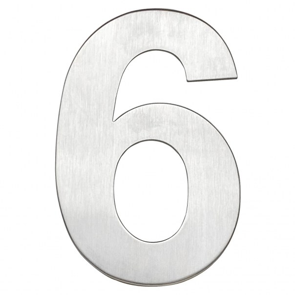 Cyfra "6" o wysokości 155 mm i grubości 2 mm wykonana ze stali nierdzewnej. Dostarczana w zestawie wraz z wkrętami do montażu naściennego.