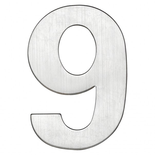 Cyfra "9" o wysokości 155 mm i grubości 2 mm wykonana ze stali nierdzewnej. Dostarczana w zestawie wraz z wkrętami do montażu naściennego.