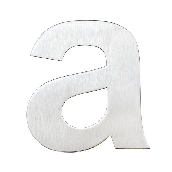 Litera "a" o wysokości 115 mm i grubości 2 mm wykonana ze stali nierdzewnej. Dostarczana w zestawie wraz z wkrętami do montażu naściennego.