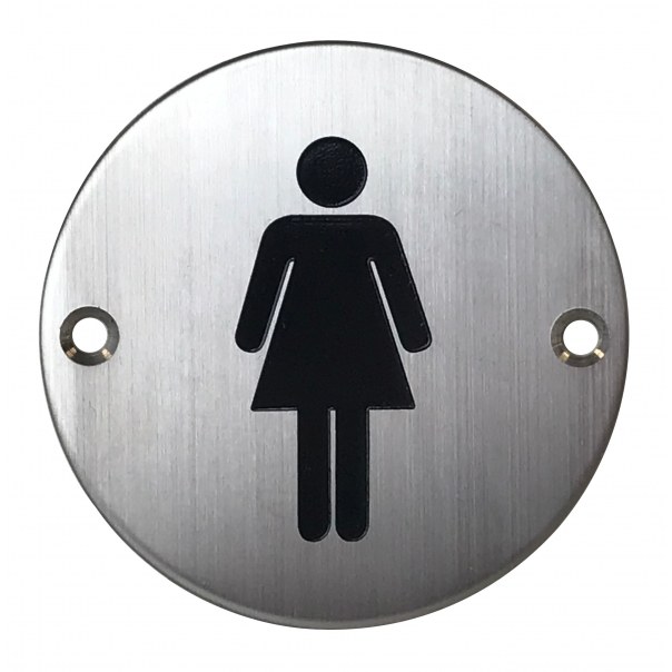 Piktogram "Toaleta damska" o średnicy 76 mm i grubości 1,5 mm. Wykonany ze stali nierdzewnej. Dostarczany wraz z wkrętami do montażu.
