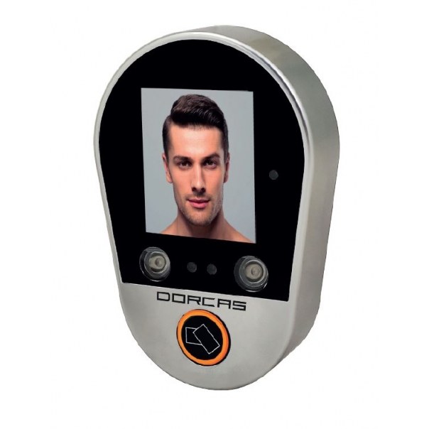 Czytnik uwierzytelniający z modułem RFID oraz modułem rozpoznawania twarzy, charakteryzujący się nowoczesną stylistyką i dedykowany do zastosowania w drzwiach z kontrolą dostępu.