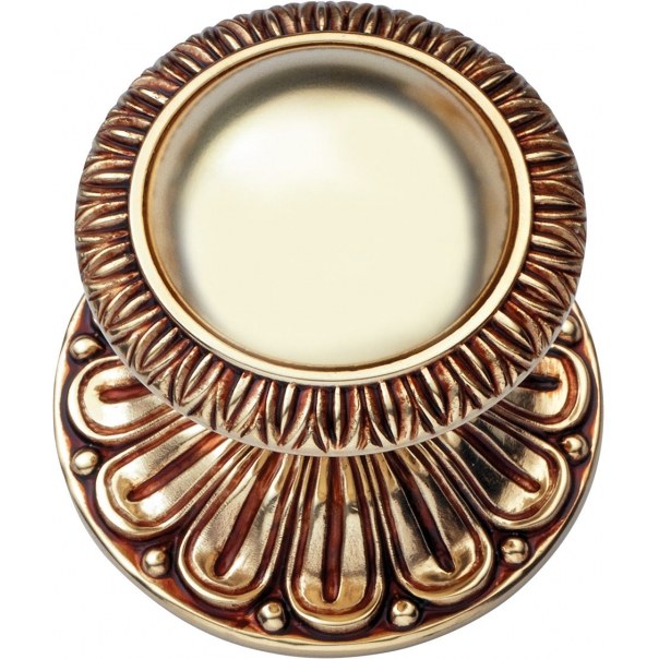Elegancka gałka stała na szyldzie o średnicy Ø80 mm. Zaprojektowana w stylu rokoko. Stanowi wspaniały dodatek do eleganckich drzwi i wnętrz zarówno w rezydencjach czy willach, jak i luksusowych hotelach oraz restauracjach, mieszczących się w pałacach, dworach itp.