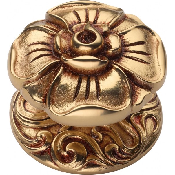 Prezentowany model gałki posiada okrągły szyld o średnicy Ø100 mm. Gałka jest wykonana z mosiądzu i występuje w wykończeniu stare złoto (francuskie).