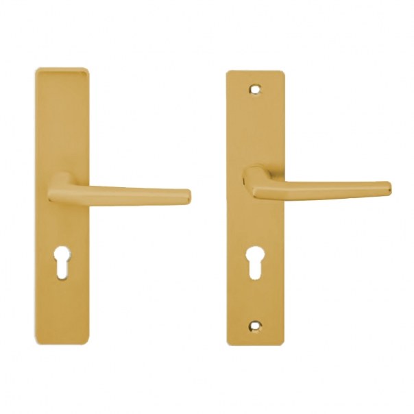 Komplet klamek na długich szyldach z otworem na wkładkę bębenkową.