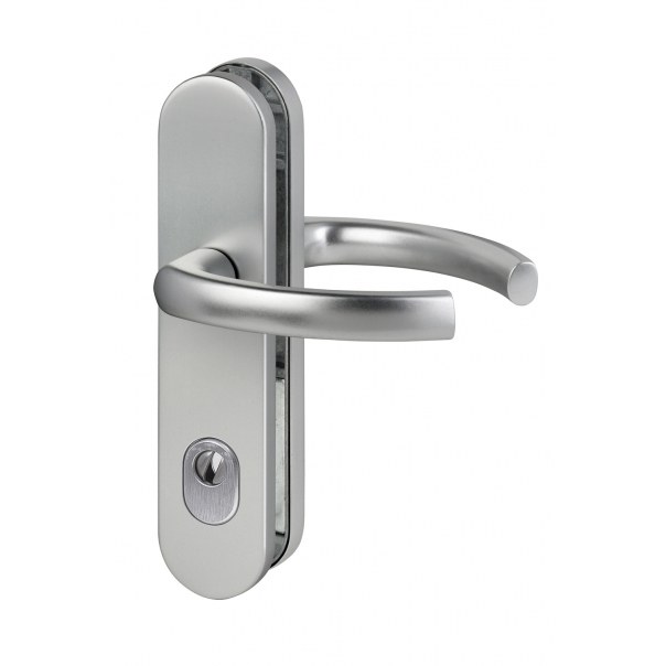 Klamka Logo na długim szyldzie z otworem na wkładkę bębenkową. Dostępna w wykończeniu anodyzowanym srebrnym (F1).