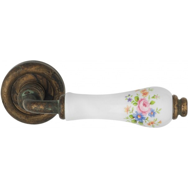 Mosiężna klamka na okrągłym szyldzie o średnicy Ø 50 mm. Zaprojektowana w stylu shabby-chic i wyposażona w smukłą rękojeść wykonaną z porcelany oraz ozdobioną motywem kwiatowym. Stanowi znakomite uzupełnienie eleganckich drewnianych drzwi w domu, mieszkaniu, biurze czy urzędzie.