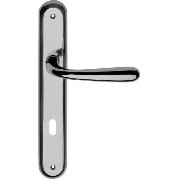 Dekoracyjna klamka drzwiowa na długim szyldzie z otworem na klucz, charakteryzująca się prostym stylem. Stanowi znakomite uzupełnienie każdych drzwi wewnętrznych w domu, mieszkaniu, biurze czy urzędzie.