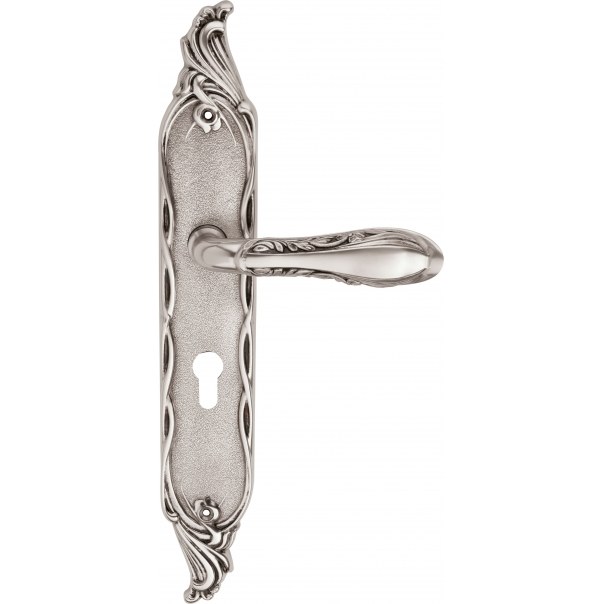 Ozdobna klamka do drzwi na długim szyldzie z otworem na wkładkę bębenkową. Wykonana z mosiądzu i dostępna w wykończeniu stare srebro.