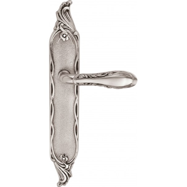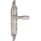 Ozdobna klamka do drzwi na długim szyldzie bez otworu. Wykonana z mosiądzu i dostępna w wykończeniu stare srebro.