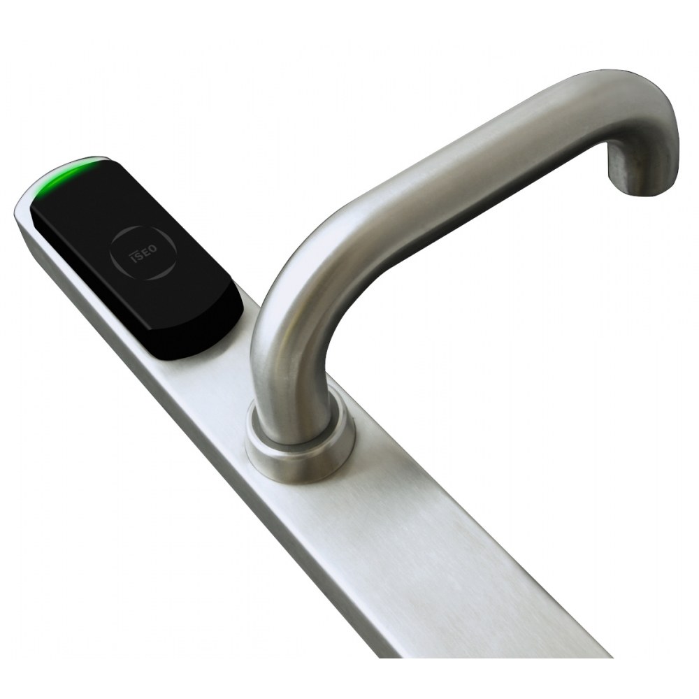 Sterowana elektronicznie klamka dedykowana do zastosowania w systemach kontroli dostępu.