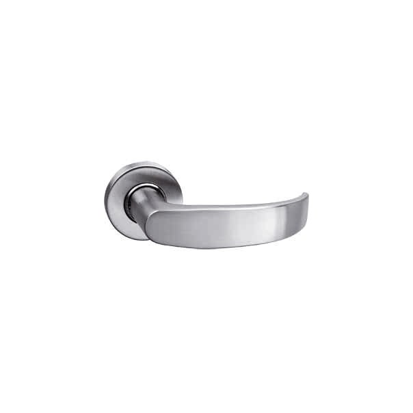 Klamka na okrągłym szyldzie wyposażona w sprężynę powrotną oraz trzpień o średnicy ⧄ 8 mm. Wykonana ze stali nierdzewnej AISI 304.