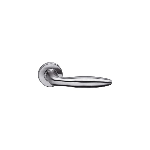 Klamka na okrągłym szyldzie wyposażona w sprężynę powrotną oraz trzpień o średnicy ⧄ 8 mm. Wykonana ze stali nierdzewnej AISI 304.