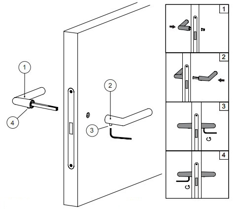 W celu zamontowania klamki należy wykonać w skrzydle otwór o maksymalnej średnicy 24 mm. Sposób montażu prezentują poniższe grafiki.