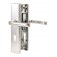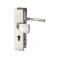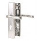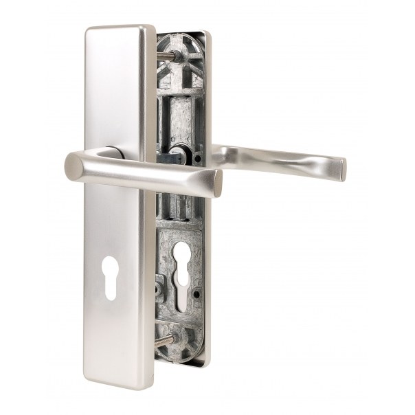 Klamka drzwiowa Juno na długim szyldzie z otworem na wkładkę bębenkową. Dostępna w wykończeniu anodyzowanym srebrnym (F1).