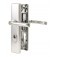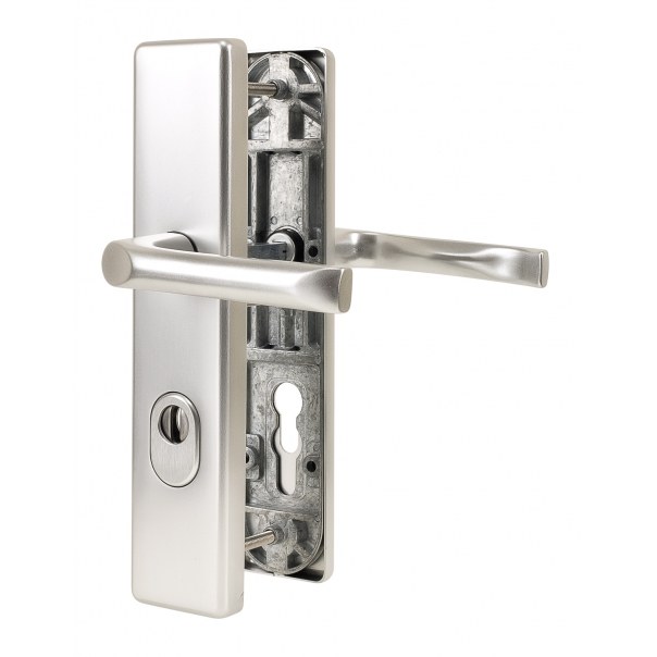 Klamka drzwiowa Juno na długim szyldzie z otworem na wkładkę bębenkową. Dostępna w wykończeniu anodyzowanym srebrnym (F1).