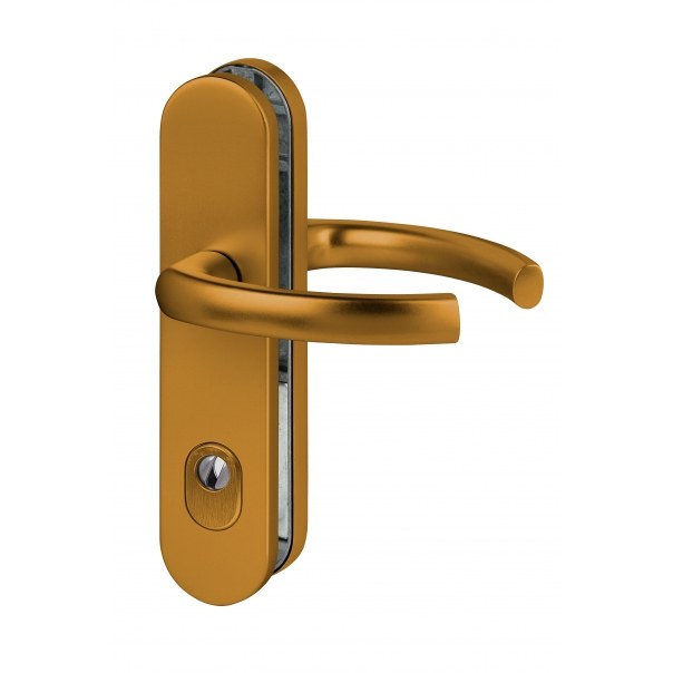 Klamka Logo na długim szyldzie z otworem na wkładkę bębenkową. Dostępna w wykończeniu anodyzowanym brązowym (F4).