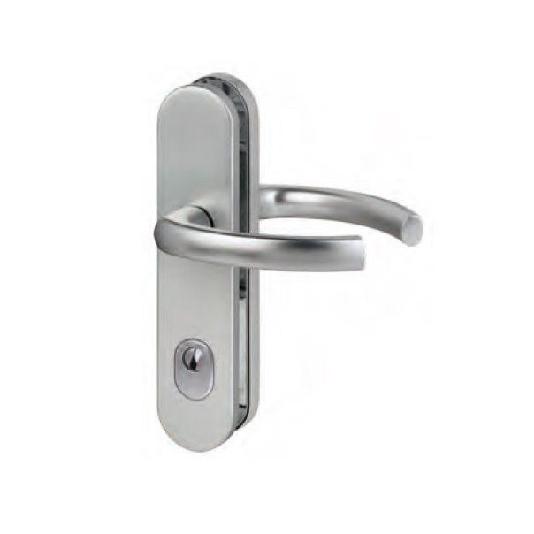 Klamka Logo na długim szyldzie z otworem na wkładkę bębenkową. Dostępna w wykończeniu anodyzowanym srebrnym (F1).