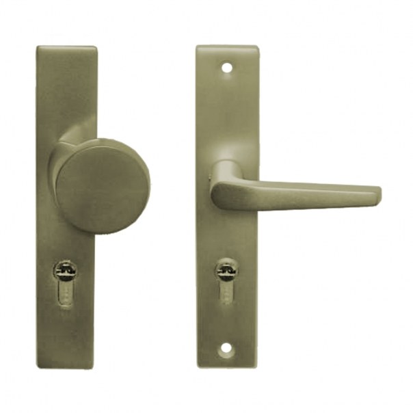 - Klamko-gałka asymetryczna na długim szyldzie o wymiarach 50x250 mm.