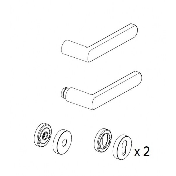 Opakowanie zawiera: rękojeść zewnętrzną, rękojeść wewnętrzną, płytkę montażowa ze wzmocnioną sprężyną i obudową dedykowaną do montażu od strony wewnętrznej drzwi oraz parę szyldów wraz z nakładkami.