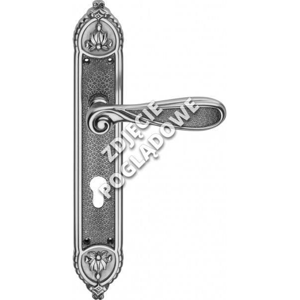 Prezentowana klamka do drzwi Aisha jest wykonana z mosiądzu. Posiada długi szyld z otworem na wkładkę bębenkową i występuje w wykończeniu NF (stare srebro + czarny).