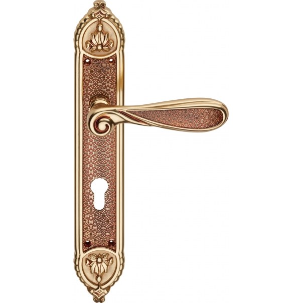 Prezentowana klamka do drzwi Aisha jest wykonana z mosiądzu. Posiada długi szyld z otworem na wkładkę bębenkową i występuje w wykończeniu stare złoto (francuskie).