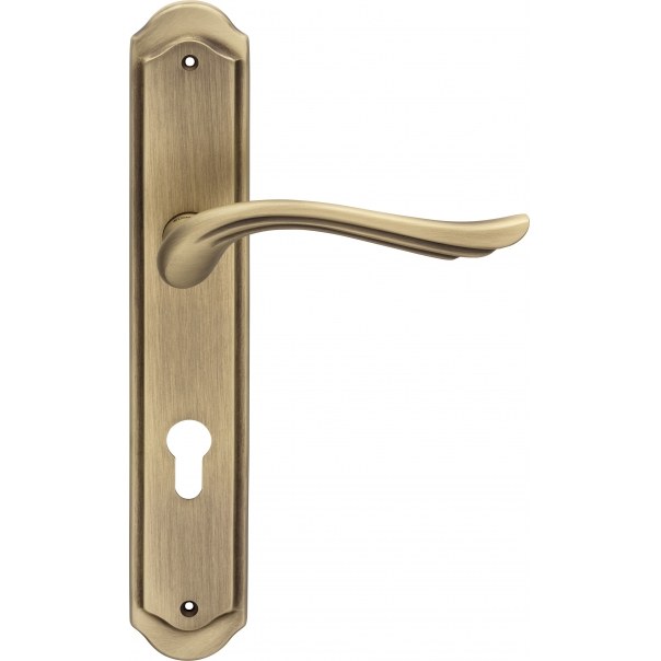 Prezentowany wariant klamki Aria posiada długi szyld z otworem na wkładkę bębenkową i występuje w wykończeniu brązowionym matowym (jasnym).