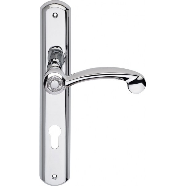 Prezentowany model klamki jest dostępny w wersji na długim szyldzie z otworem na wkładkę i występuje w wykończeniu chromowanym.