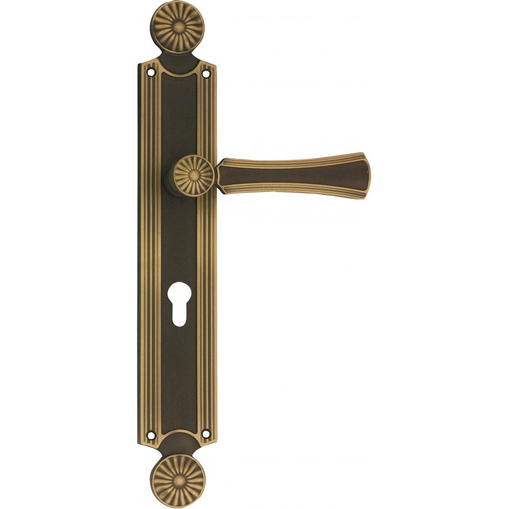 Mosiężna klamka na długim szyldzie z otworem na wkładkę bębenkową. Zarówno jej wzornictwo, forma, jak i kształt nawiązują do słynnego i popularnego w latach dwudziestych i trzydziestych ubiegłego wieku stylu Art Déco.