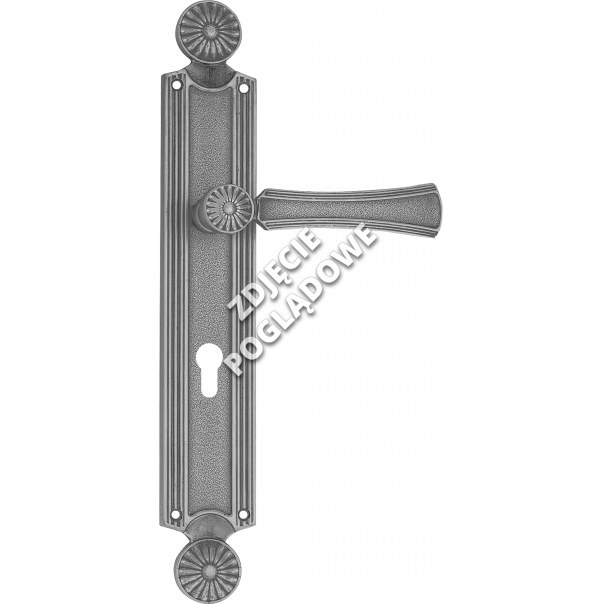 Prezentowany model jest dostępny na długim szyldzie z otworem na wkładkę bębenkową i występuje w wykończeniu stare złoto (francuskie).