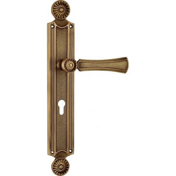 Mosiężna klamka na długim szyldzie z otworem na wkładkę bębenkową. Zarówno jej wzornictwo, forma, jak i kształt nawiązują do słynnego i popularnego w latach dwudziestych i trzydziestych ubiegłego wieku stylu Art Déco.