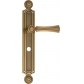Mosiężna klamka na długim szyldzie z blokadą WC. Zarówno jej wzornictwo, forma, jak i kształt nawiązują do słynnego i popularnego w latach dwudziestych i trzydziestych ubiegłego wieku stylu Art Déco.