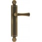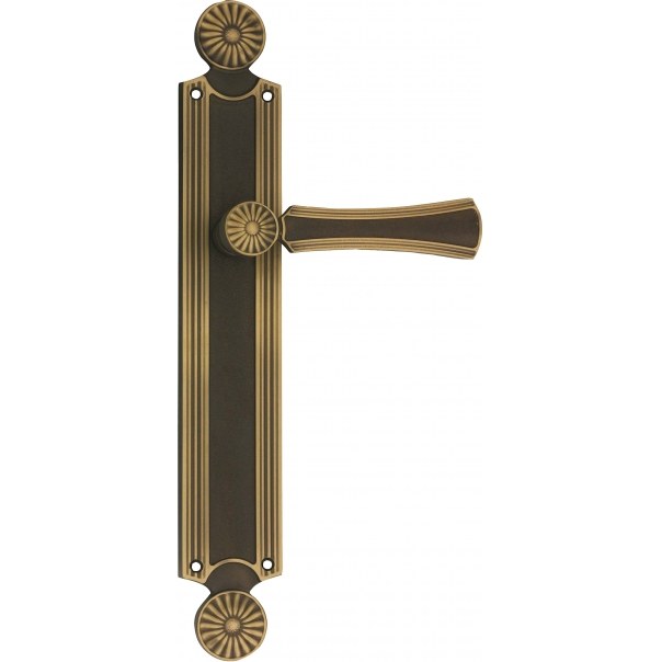 Mosiężna klamka na długim szyldzie bez otworu. Zarówno jej wzornictwo, forma, jak i kształt nawiązują do słynnego i popularnego w latach dwudziestych i trzydziestych ubiegłego wieku stylu Art Déco.