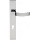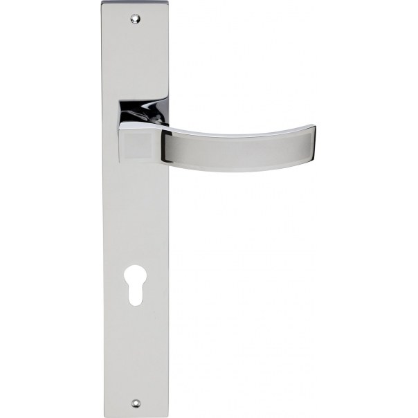 Klamka drzwiowa na długim szyldzie z otworem na wkładkę. Montowana na śruby i wkręty. Wykonana z mosiądzu i dostępna w wykończeniu chromowanym i chromowanym piaskowanym.