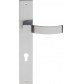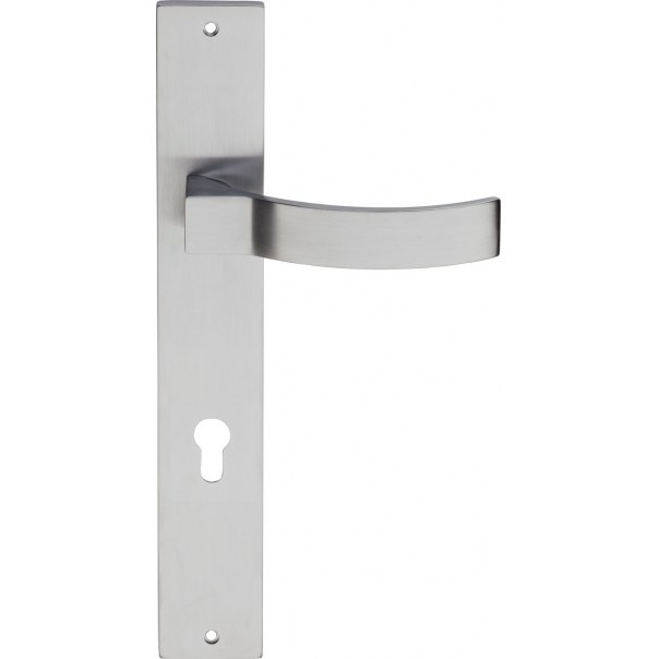 Klamka drzwiowa na długim szyldzie z otworem na wkładkę. Montowana na śruby i wkręty. Wykonana z mosiądzu i dostępna w wykończeniu chromowanym matowym.
