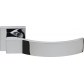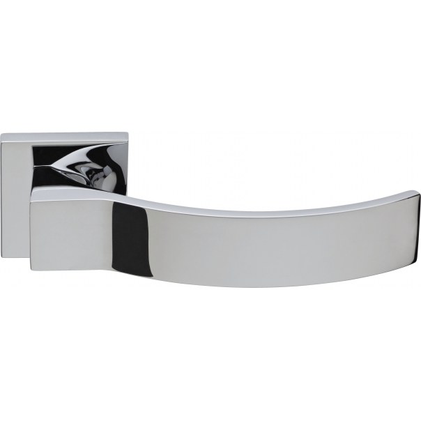 Klamka drzwiowa na kwadratowym szyldzie. Montowana na śruby i wkręty. Wykonana z mosiądzu i dostępna w wykończeniu chromowanym.