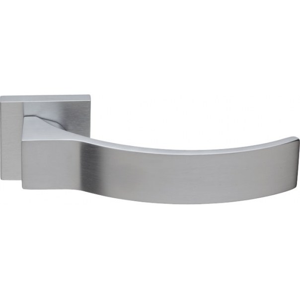 Klamka drzwiowa na kwadratowym szyldzie. Montowana na śruby i wkręty. Wykonana z mosiądzu i dostępna w wykończeniu chromowanym matowym.