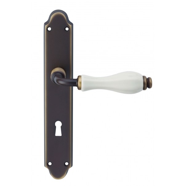Klamka drzwiowa Erica Porcellana Bianca jest wykonana z mosiądzu i występuje w wykończeniu brązowionym matowym (ciemnym).