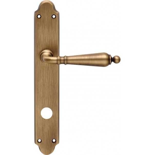 Klamka posiada długi szyld o wymiarach 40x240 mm z blokadą WC. Została wykonana z mosiądzu i jest dostępna w wykończeniu brązowionym matowym (jasnym).