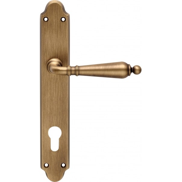 Klamka posiada długi szyld o wymiarach 40x240 mm z otworem na wkładkę. Została wykonana z mosiądzu i jest dostępna w wykończeniu brązowionym matowym (jasnym).