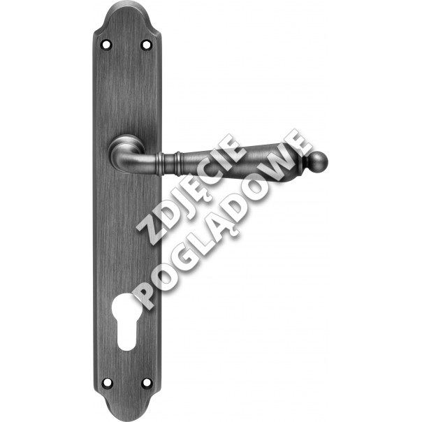 Klamka posiada długi szyld o wymiarach 40x240 mm z otworem na wkładkę. Została wykonana z mosiądzu i jest dostępna w wykończeniu patynowanym.
