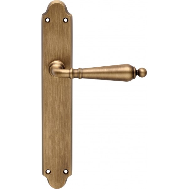 Klamka posiada długi szyld o wymiarach 40x240 mm bez otworu. Została wykonana z mosiądzu i jest dostępna w wykończeniu brązowionym matowym (jasnym).