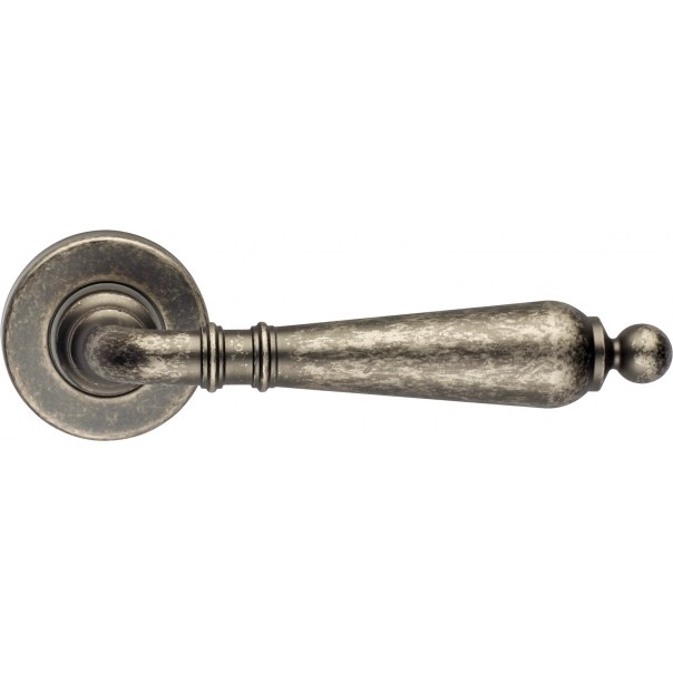 Klamka posiada okrągły szyld o średnicy Ø 50 mm. Została wykonana z mosiądzu i jest dostępna w wykończeniu patynowanym stare srebro.