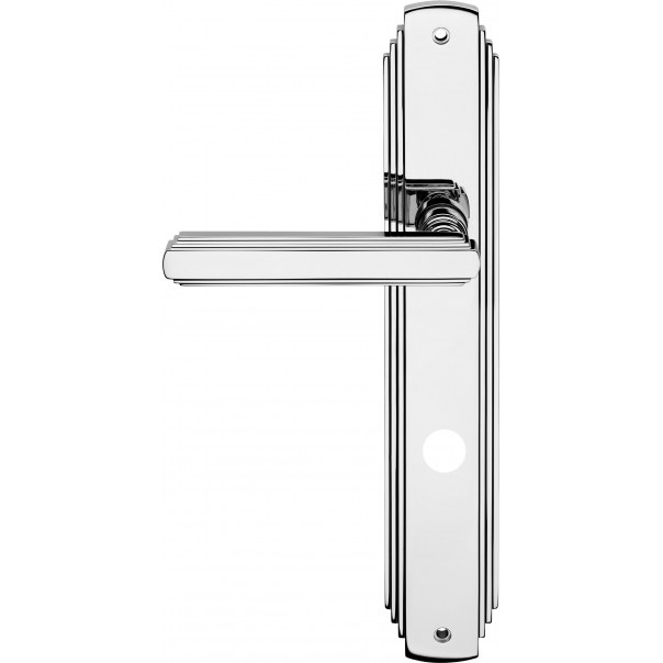 Prezentowany wariant klamki Glamor posiada długi szyld z blokadą WC i jest dostępny w wykończeniu chromowanym.