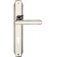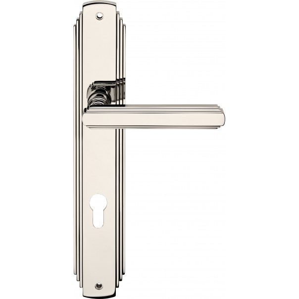 Prezentowany wariant klamki Glamor posiada długi szyld z otworem na wkładkę i jest dostępny w wykończeniu niklowanym błyszczącym.