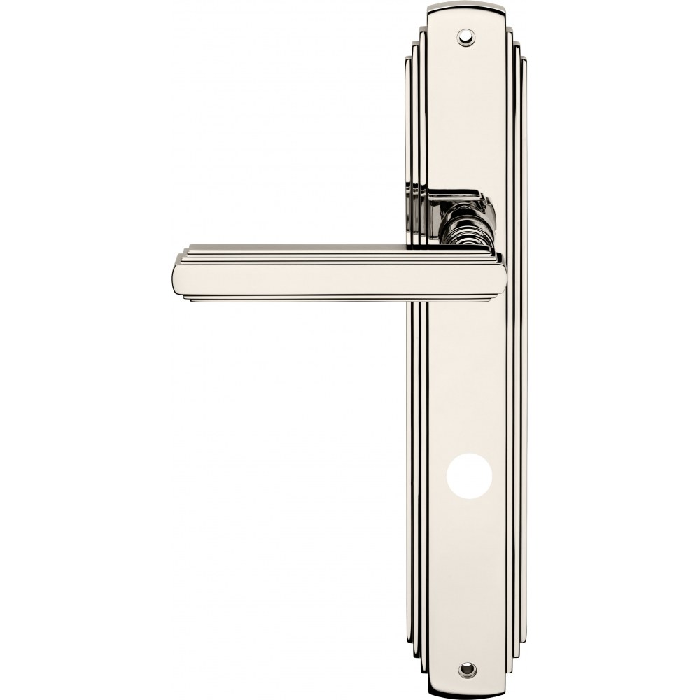 Prezentowany wariant klamki Glamor posiada długi szyld z blokadą WC i jest dostępny w wykończeniu niklowanym błyszczącym.
