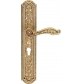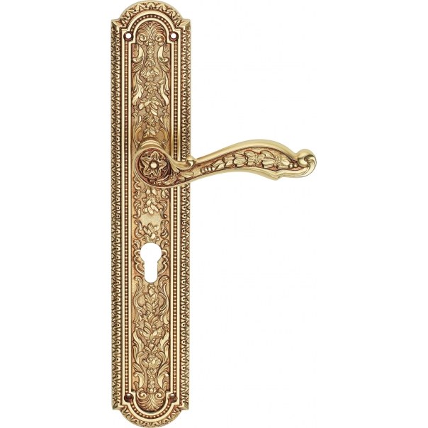 Jardin to bardzo elegancka klamka drzwiowa z kolekcji Vintage, zaprojektowana w stylu Ludwika XIV. Już na pierwszy rzut oka można zauważyć, że jej niezwykle bogate zdobienia nawiązują do najwspanialszych dzieł francuskiego baroku, znanych między innymi z pałacu królewskiego w Wersalu. Prezentowany model klamki posiada długi szyld z otworem na wkładkę bębenkową. Klamka została wykonana z mosiądzu i jest dostępna w wykończeniu stare złoto (francuskie).