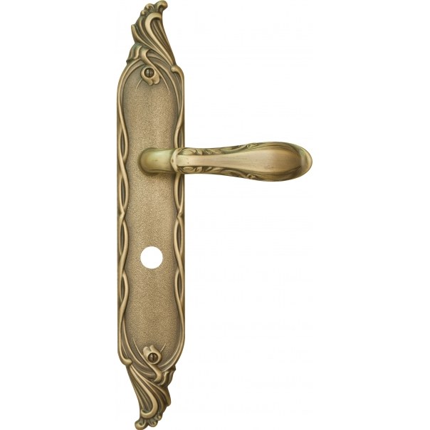 Ozdobna klamka do drzwi na długim szyldzie z blokadą WC. Odpowiednia do drzwi prawych. Wykonana z mosiądzu i dostępna w wykończeniu brązowionym matowym (jasnym).