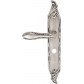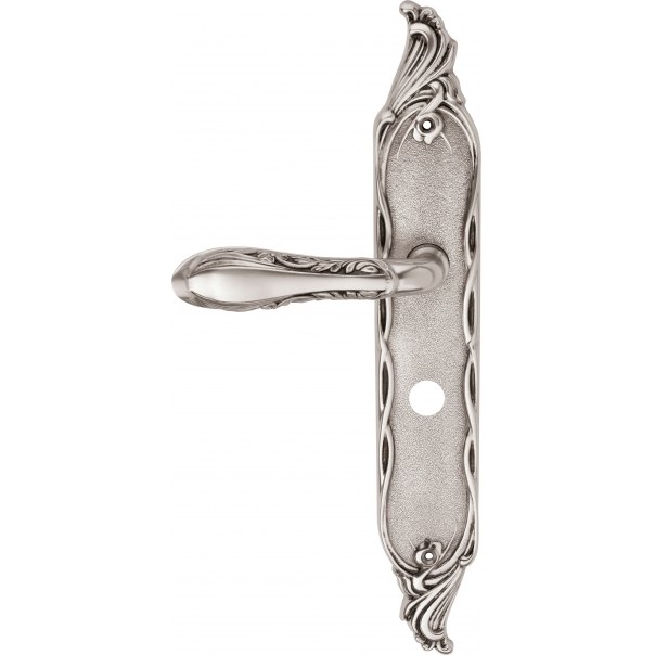 Ozdobna klamka do drzwi na długim szyldzie z blokadą WC. Odpowiednia do drzwi lewych. Wykonana z mosiądzu i dostępna w wykończeniu stare srebro.